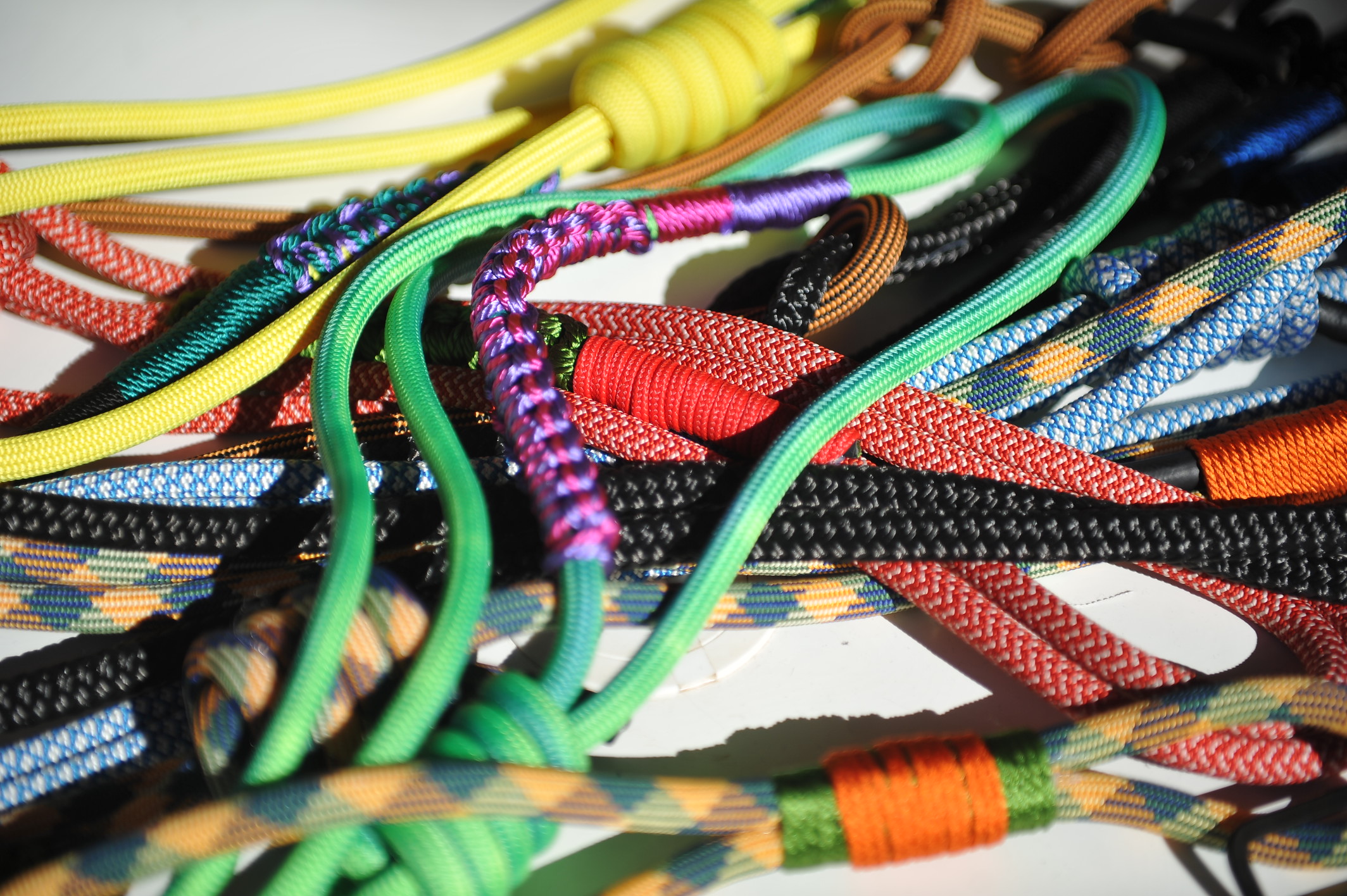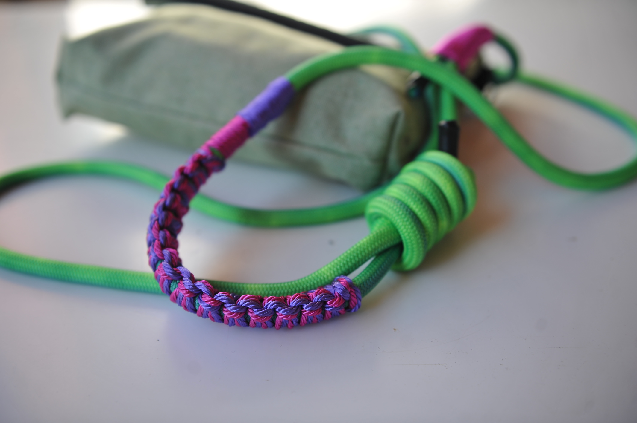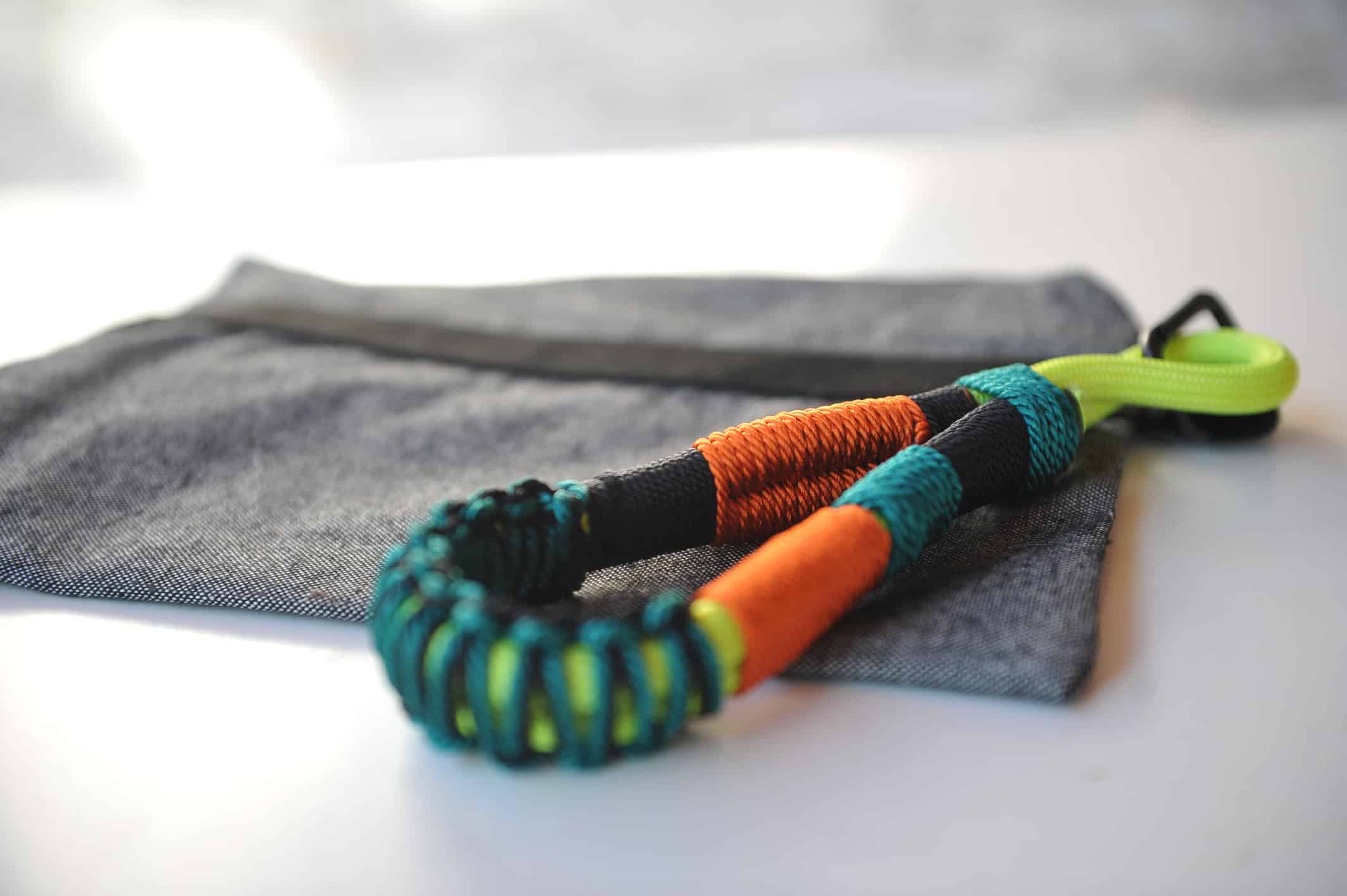 Et puc fer la corretja que vulguis amb les cordes que tinc disponibles. Pots escollir llargada, disseny i colors. Inclou dos mosquetons.